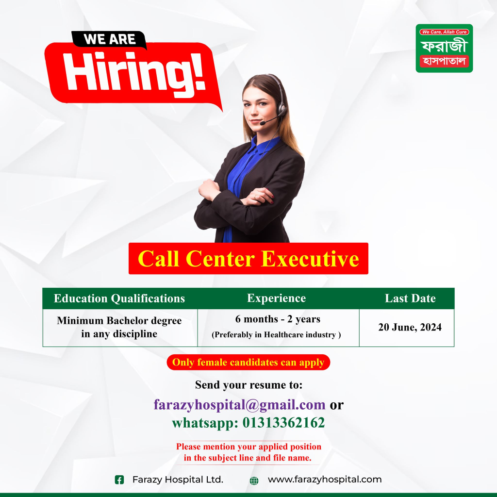 If you are passionate about providing exceptional customer service and thrive in a dynamic healthcare environment, we encourage you to apply for the Call Center Executive position at Farazy Hospital Ltd. Please submit your resume and a brief cover letter outlining your relevant experience and why you are a good fit for this role to farazyhospital@gmail.com or WhatsApp: 01313362162 before 20 June 2024